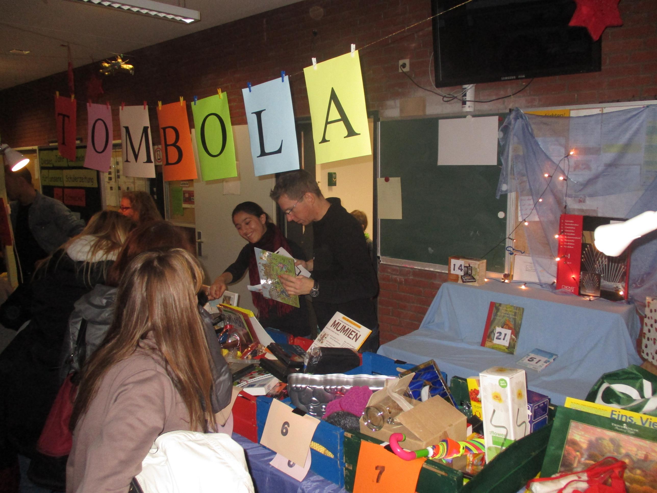 Die Schulband mit Chor spielte Weihnachtslieder in der Eingangshalle und die Tombola, die ebenfalls ihren Platz in der Eingangshalle eingenommen hatte, verloste wieder zahlreiche und attraktive Preise. Durch das große Engagement vieler Kolleginnen und Kollegen sowie Sachspenden lokaler Geschäfte war es wieder möglich geworden: JEDES Los gewinnt! Der Erlös kommt in diesem Jahr der "Schnecke", der Schülerzeitung der Wilhelm-Schade-Schulezugute. Ein besonderer Dank gilt an dieser Stelle den umliegenden Geschäften und den zahlreichen Privatpersonen, die unsere Tombola mit zahlreichen Sachspenden unterstützt haben.